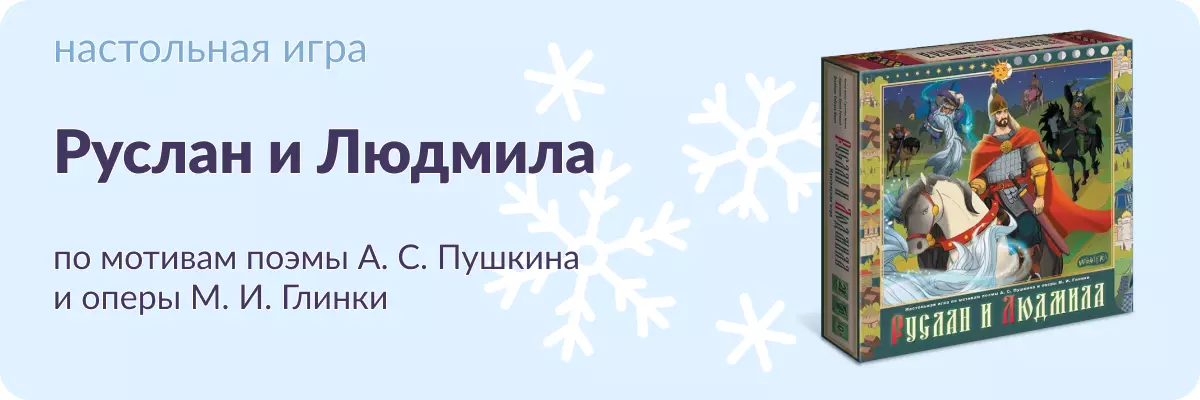 Настольная игра «Руслан и Людмила» поможет интересно провести семейный или школьный досуг. Игроки осознают, что история богатыря, его друзей и любимой жены — не просто «Дела давно минувших дней, преданье старины глубокой», а насыщенный событиями этап российской истории.