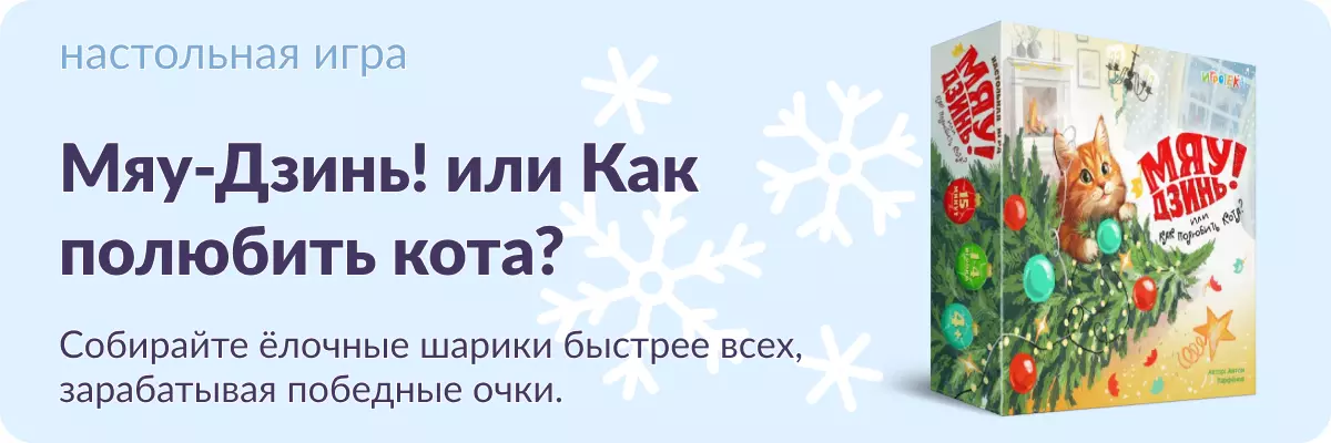 Дружная семья в предвкушении новогодних праздников украсила ёлочку. Но шаловливый домашний питомец нарушил идиллию! Настольная игра «Мяу-Дзинь! или Как полюбить кота?» помогает поддержать праздничное настроение, развивает концентрацию внимания, логическое мышление, креативность, усидчивость. Преимущество игры в том, что в неё можно играть с 4-х лет, в том числе в режиме соло. А это значит, что ребёнок может занять себя, пока мама строгает новогодние салаты на праздничный стол, а папа ушёл в магазин за горошком. Эта забава может стать доброй новогодней традицией, если в неё играть исключительно в период новогодних хлопот и каникул, а потом убирать вместе с ёлочными игрушками до следующего праздника.