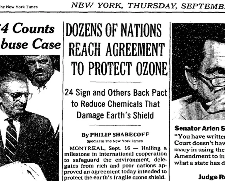 Архив The New York Times от 16 сентября 1987 года. Дюжина стран достигли соглашения по защите озонового слоя. 24 — подписали, а другие поддерживают пакт о сокращении [использования] химикатов, разрушающих земной щит.