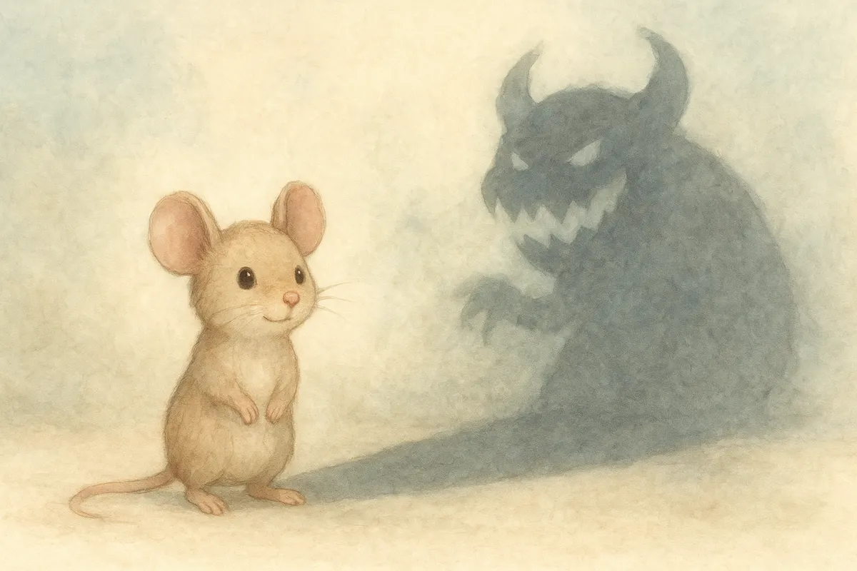 Стабильный и предсказуемый мир днём буквально исчезает в хаосе темноты, где знакомые очертания шкафа превращаются в огромных чудищ, а складка на покрывале кажется рукой монстра. Это метафора того, как ребёнок чувствует себя в новом учебном году: привычный летний «порядок» сменился новым, ещё не до конца понятным и потому пугающим.
