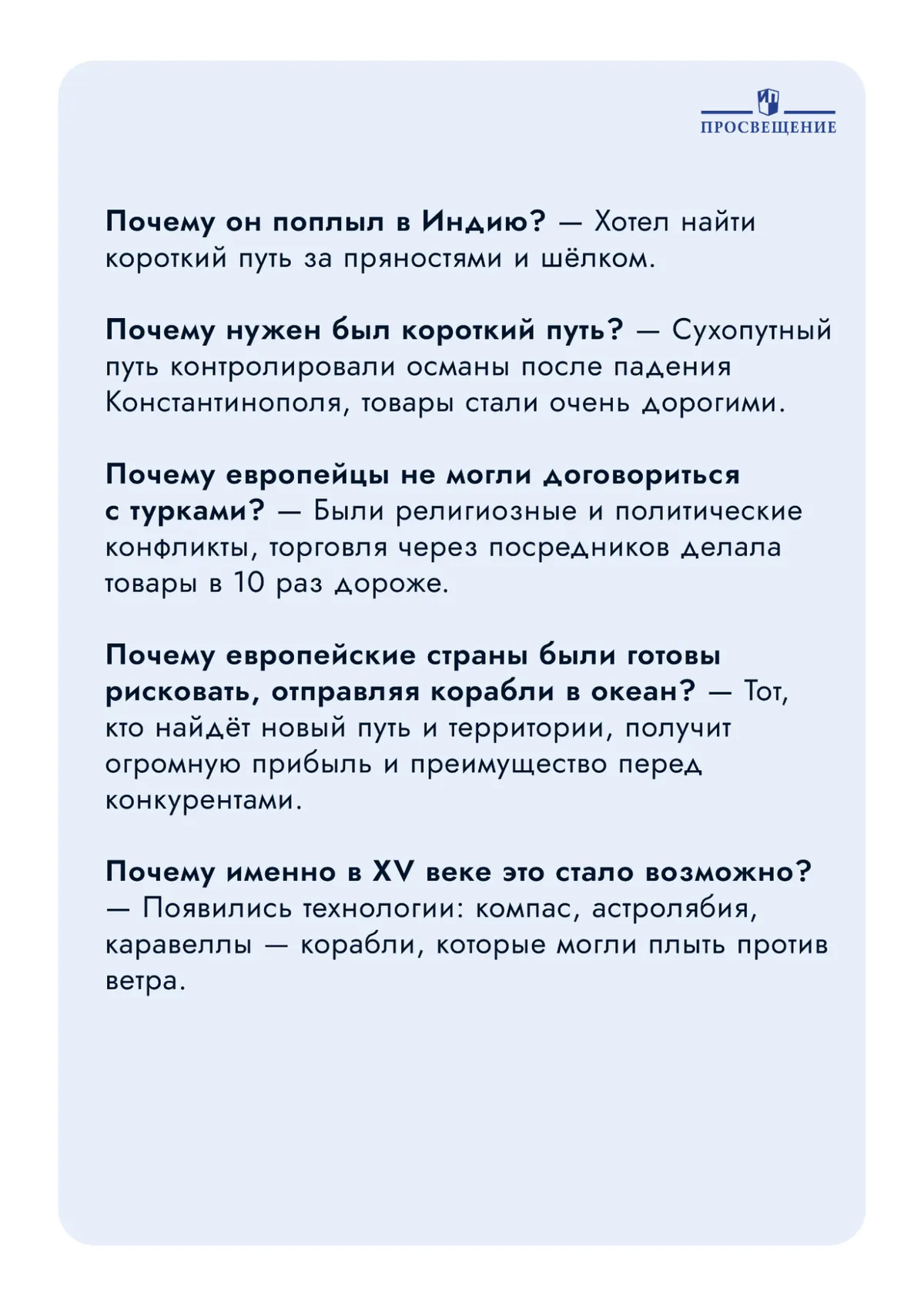 Возьмём «Великие географические открытия». Колумб поплыл в Индию, а прибыл в Америку.