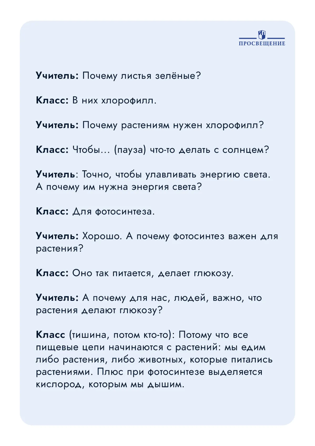 За пять вопросов вы прошли путь от «почему листья зелёные» до «как устроена жизнь на Земле». Причём не вы рассказали, а класс сам дошёл. Значит, лучше запомнят!