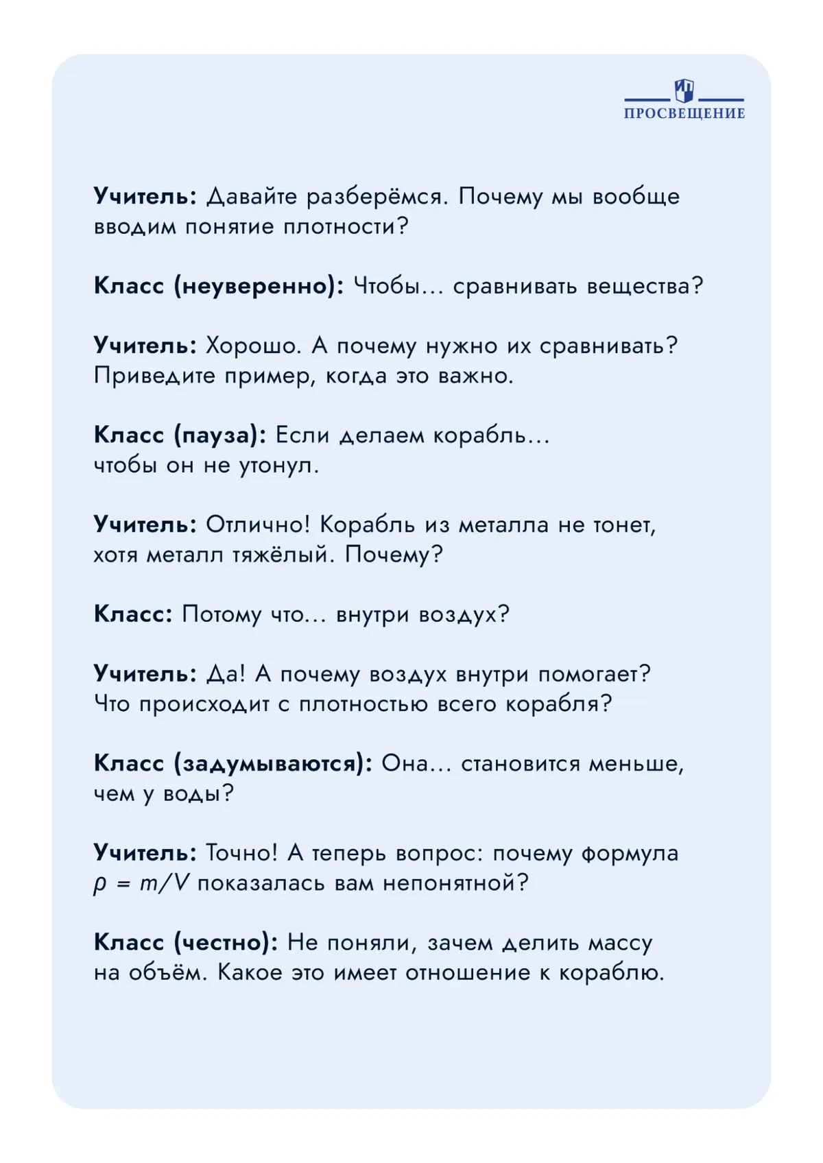 И выясняется, что проблема не в формуле, а в том, что дети не видят связи между абстрактным определением и реальностью. Они запомнили буквы, но не поняли физический смысл: плотность показывает, насколько плотно «упакованы» частицы в веществе. Кусок железа тяжёлый и маленький (высокая плотность), а огромный корабль с воздухом внутри — лёгкий для своего размера (низкая плотность).