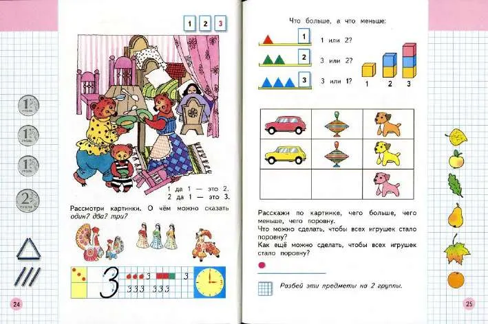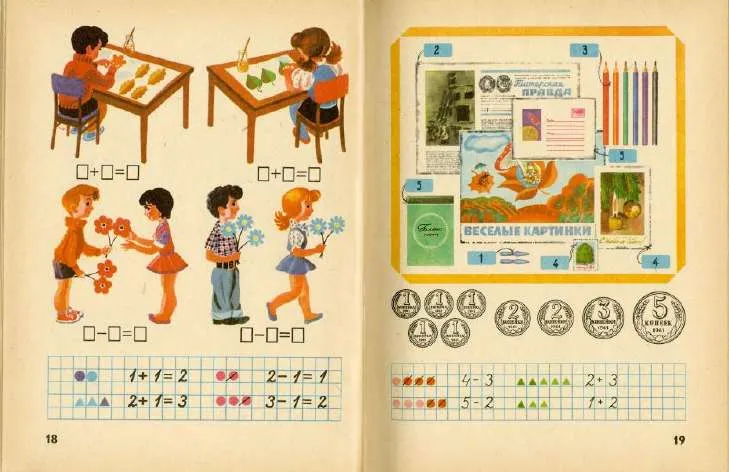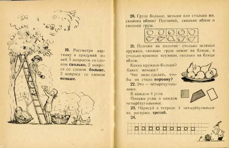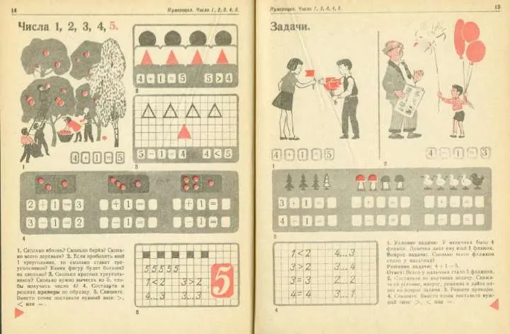 Понимая, что читающих детей в начальных классах тогда было немного, авторы предусмотрели, что тексты заданий, адресованные учителю, будут печататься к каждому уроку мелким шрифтом прямо в учебнике. После крупных тем давался дополнительный материал для упражнений, который учитель мог использовать по своему усмотрению. На форзацах в начале и в конце книги была размещена игра «Кто скорее?», помогавшая закреплять вычислительные навыки. Учебник становился не только книгой для ребёнка, но и инструментом организации урока для педагога.