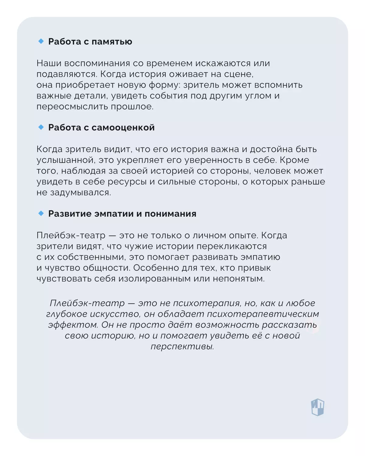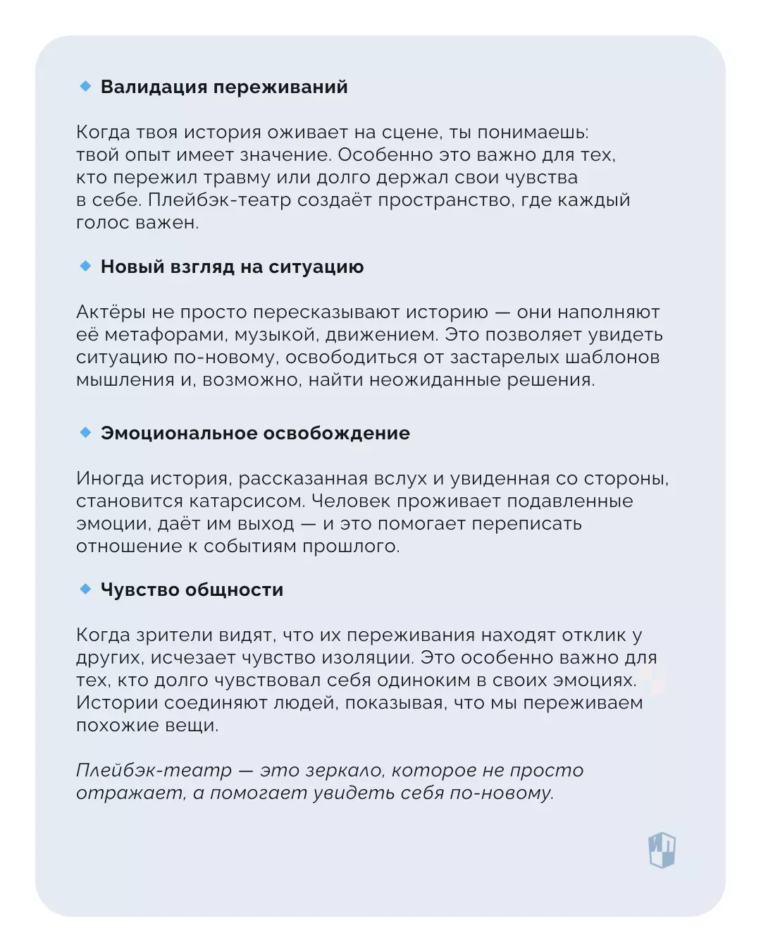 Зрительский опыт, полученный на спектаклях форум-театра и плейбэк-перформансах, расширяет понимание отношений — как между людьми, так и с самим собой. Он позволяет увидеть нюансы, которые долгое время оставались «в тени».