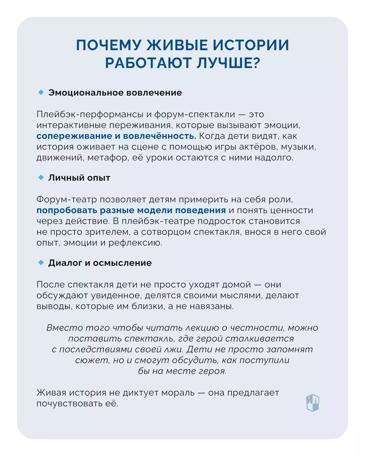 Театр — это способ пережить ценности, а не просто услышать о них. В отличие от нравоучений и сухих рассказов, театральные постановки позволяют детям глубже прочувствовать историю, проникнуться её смыслом и запомнить надолго. Именно на этом принципе строится проект «Место историй».