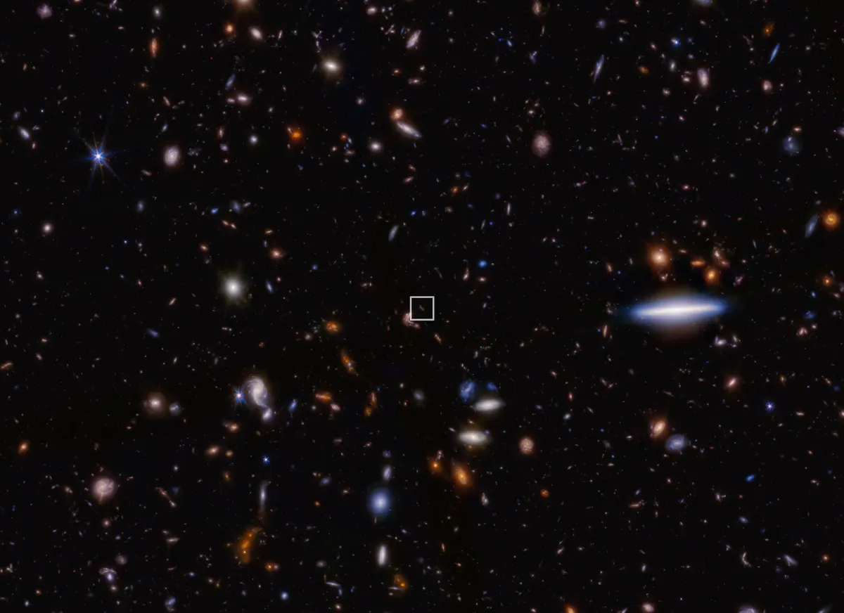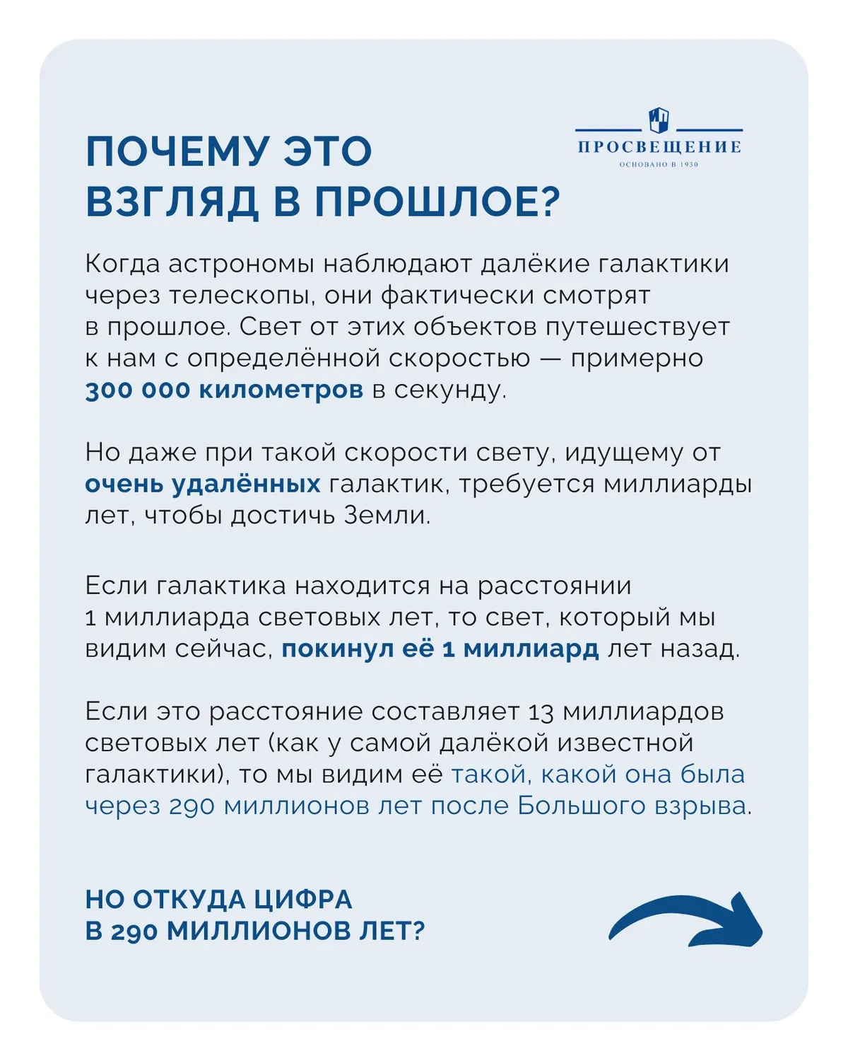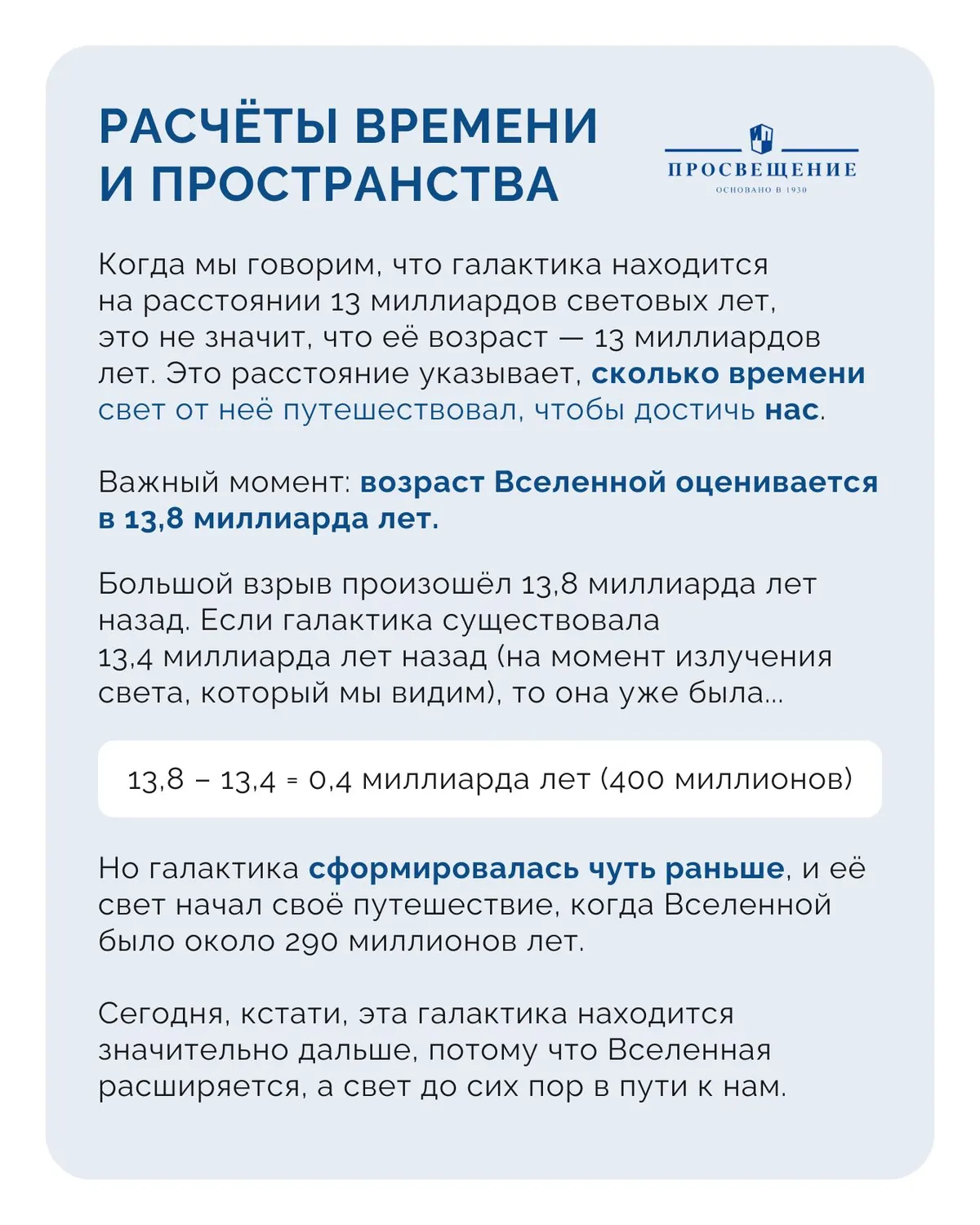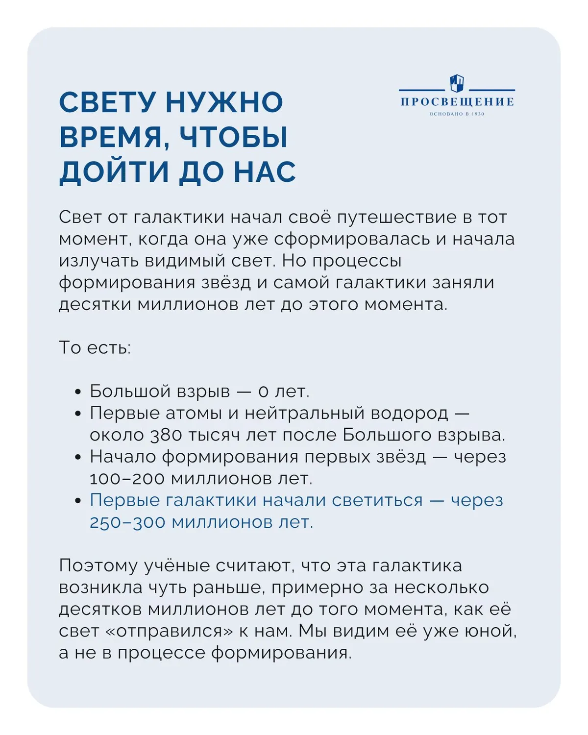 Итак, в 2023 году команда астрономов, работающая с Уэббом, обнаружила самую далёкую известную галактику. Свет от неё шёл к нам 13,4 миллиарда лет, что соответствует возрасту Вселенной всего 290 миллионов лет после Большого взрыва. Да-да, именно «всего». Это время, когда первые звёзды и галактики только начали формироваться.