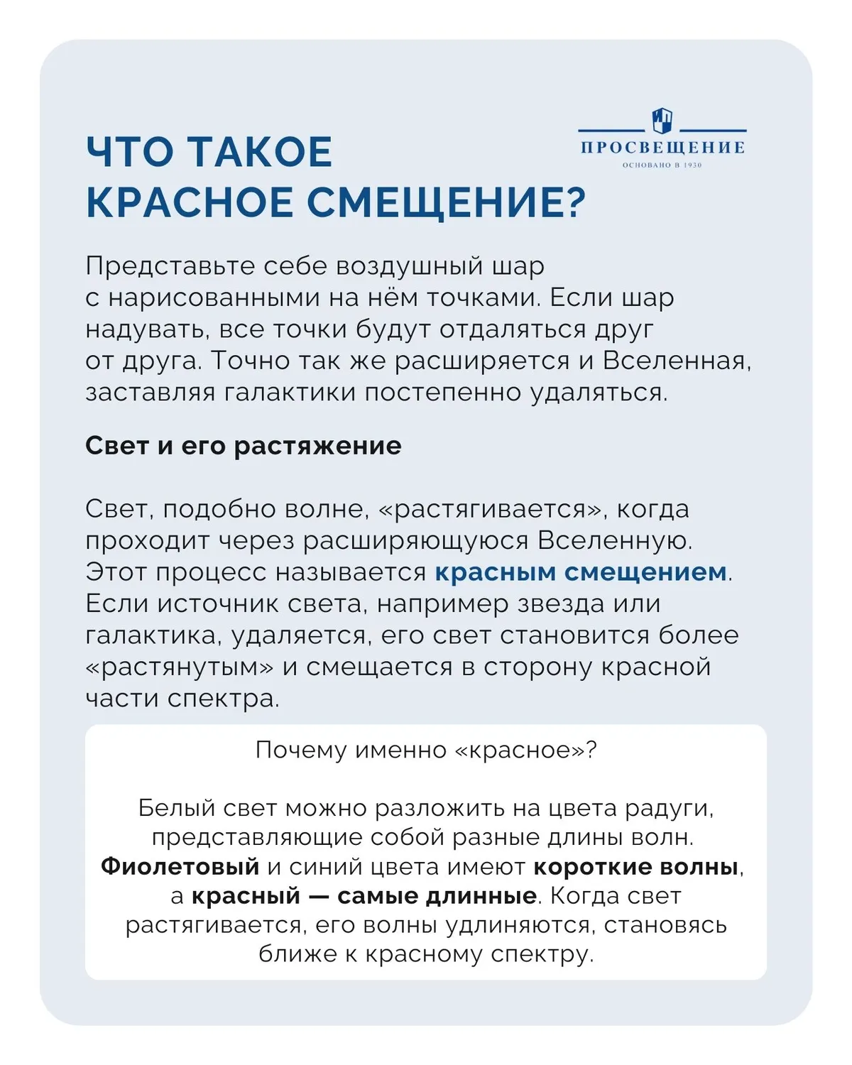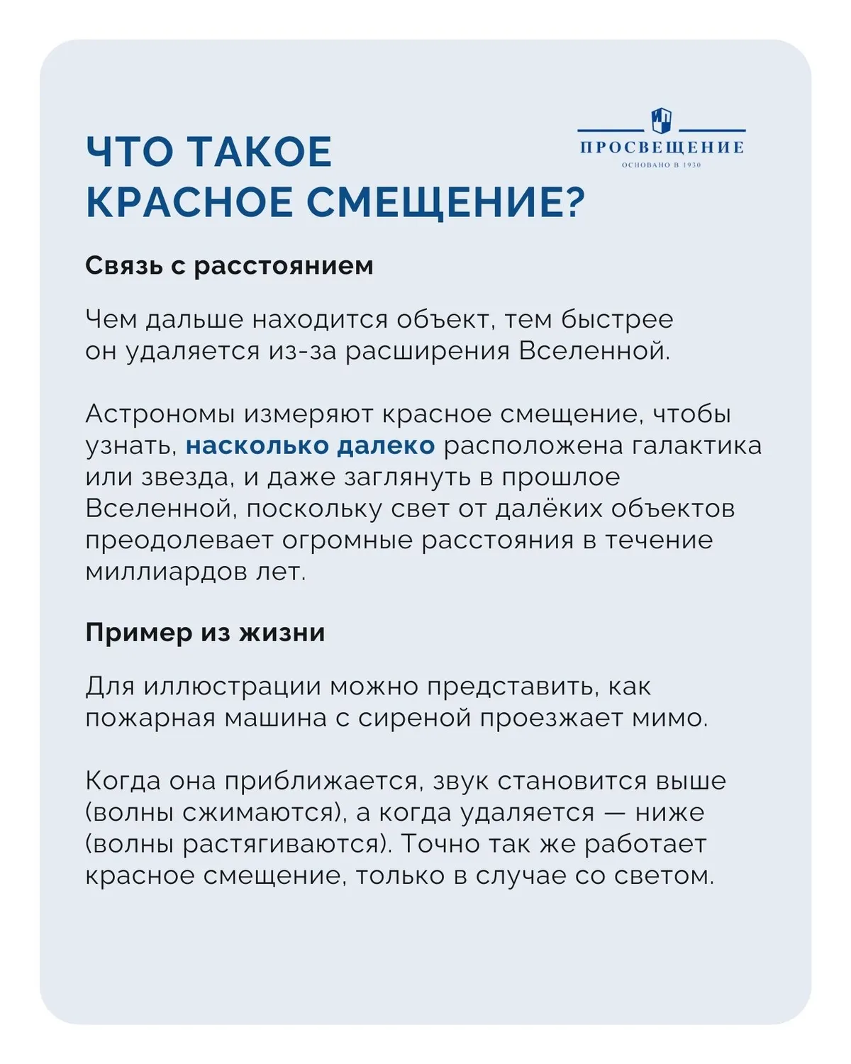 Когда свет проходит через пространство, Вселенная расширяется, и длина волны этого света растягивается. Такой эффект называется красным смещением. Чем дальше объект, тем больше его свет смещается в сторону инфракрасного диапазона. Поэтому старые телескопы не могли увидеть свет от ранних галактик — он был невидимым для их инструментов.