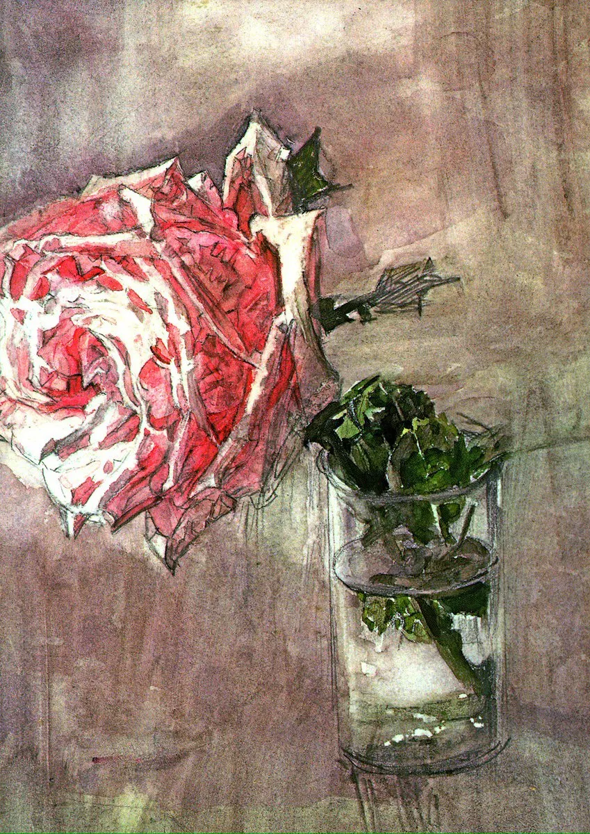 Среди поздних работ Врубеля есть одна, которую можно назвать манифестом всего его метода. Это акварель «Роза» 1904 года — срезанный цветок в стакане воды, написанный в психиатрической клинике доктора Усольцева.