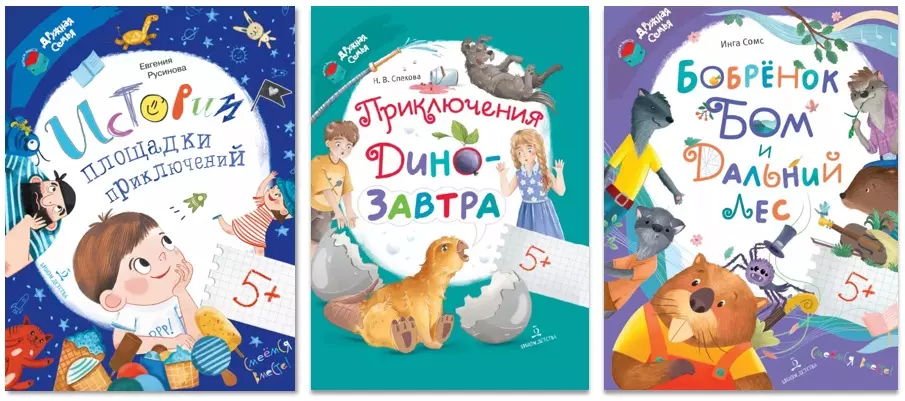 Книги для семейного чтения с дошкольниками. Например, «Истории площадки приключений», которые рассказывают про мальчика, побывавшего всюду — от Антарктиды до космоса, не выходя из песочницы. Или «Приключения Динозавтра» Натальи Спеховой, повествующие о том, как мальчик Вова и пёс Митрофан пытались воспитать найдёныша-динозавра, который всё время пытался увильнуть от разных обязанностей — от соблюдения правил приличия до процедур гигиены. Или долгожданное продолжение истории бобрёнка Бома Инги Сомс «Бобрёнок Бом и Дальний лес», из которой мы узнаём, какие ещё препятствия предстоит пройти малышу на пути к своей мечте стать музыкантом.