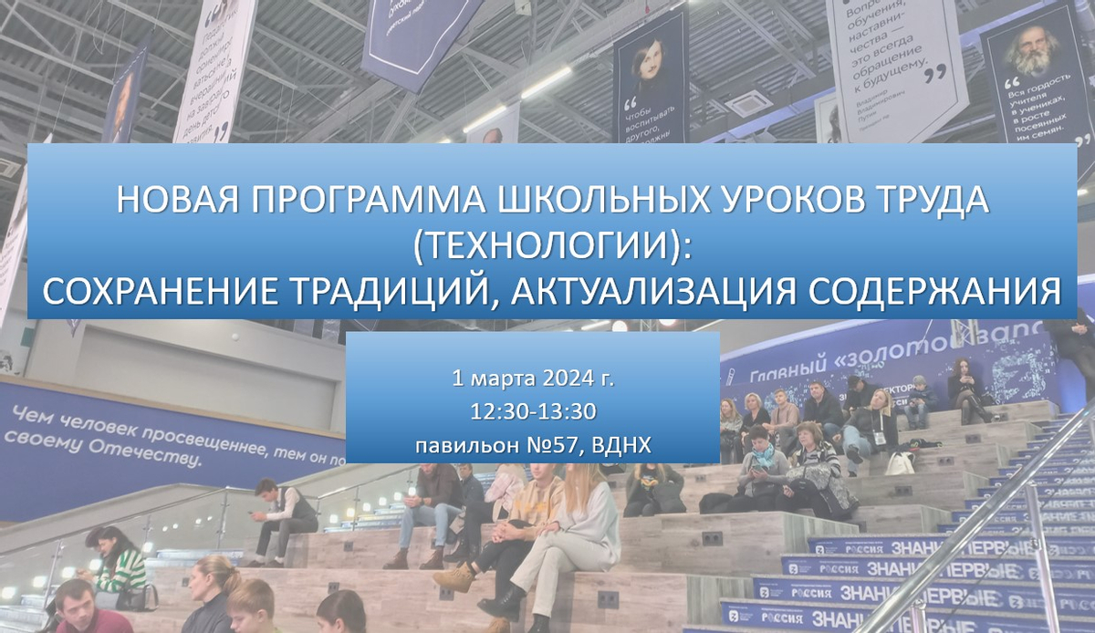 1 марта 2024 года в 12:30-13:30 на выставке-форуме «Россия» в павильоне №57 состоится панельная дискуссия «Новая программа школьных уроков труда (технологии): сохранение традиций, актуализация содержания». Для участия в мероприятии нужно пройти бесплатную регистрацию.