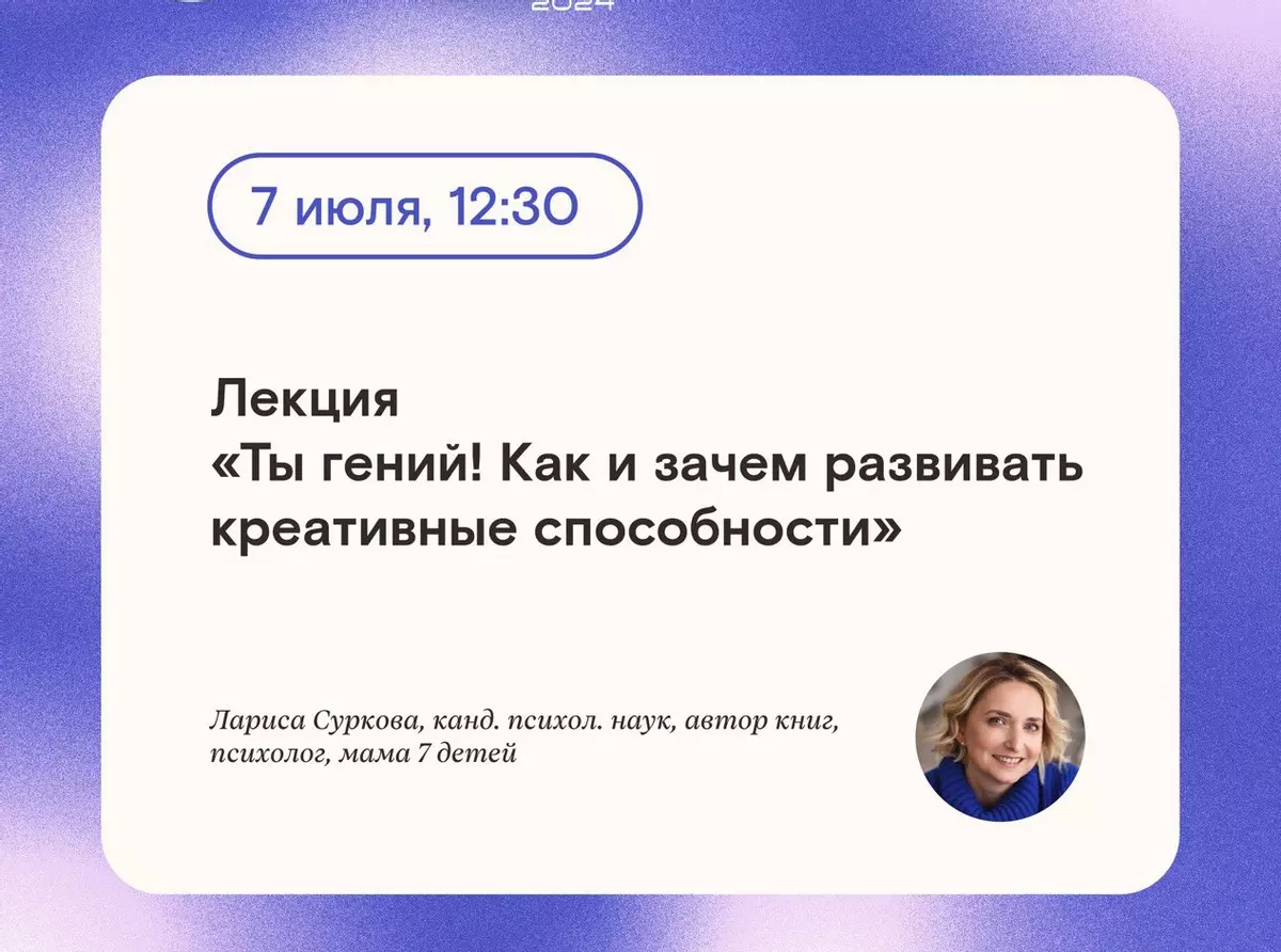 7 июля в 12:30 в павильоне «Сбер» на ВДНХ в рамках программы «Просвещения» и «Родительского университета» на Российской креативной неделе выступит с лекцией кандидат психологических наук, автор 25 книг по психологии, мама 7 детей Лариса Суркова.