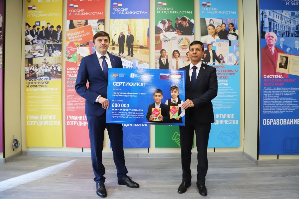 Министр просвещения РФ Сергей Кравцов посетил Таджикистан с рабочим визитом, в ходе которого передал школам Республики сертификат на 800 тыс. экземпляров учебников, изданных в «Просвещении».