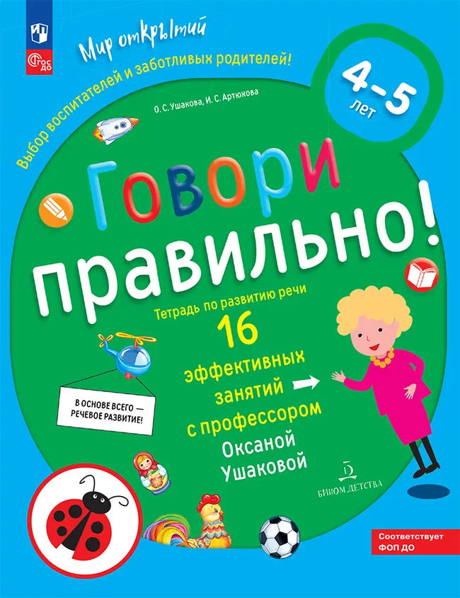 Тетрадь доктора педагогических наук, профессора О. С. Ушаковой входит в комплект, реализующий образовательную программу дошкольного образования Мир открытий" (научный руководитель Л. Г. Петерсон) и предназначена для занятий в детском саду и дома с младшими дошкольникам – детьми 4-5 лет.