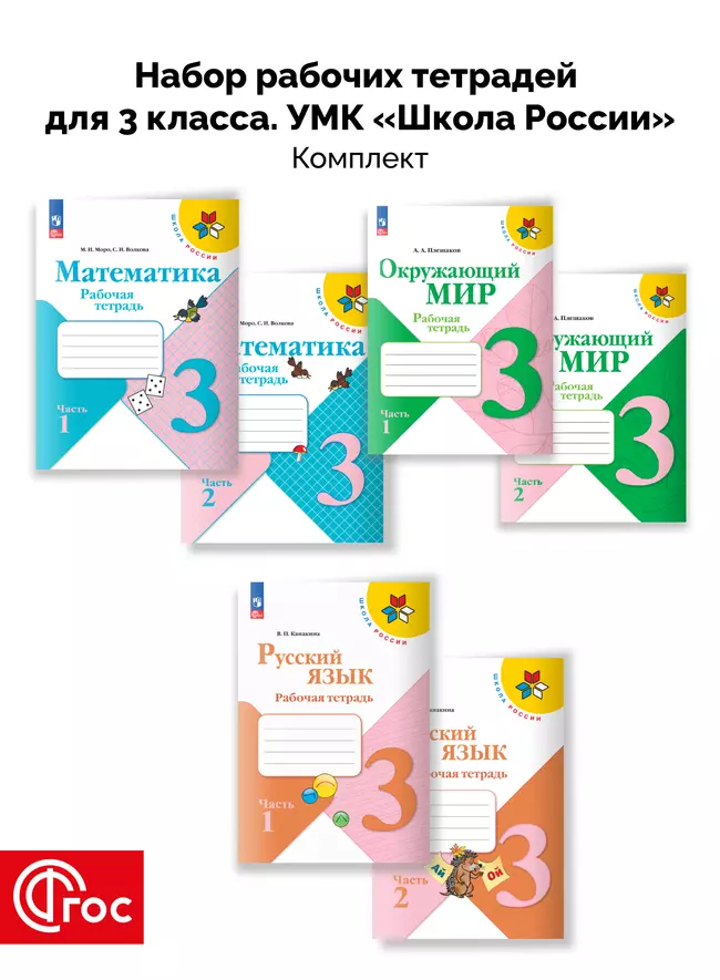 Набор рабочих тетрадей для 3 класса. УМК "Школа России". Комплект состоит из: - Русский язык. Рабочая тетрадь. 3 класс. В 2-х ч. Ч. 1 - Русский язык. Рабочая тетрадь. 3 класс. В 2-х ч. Ч. 2 - Математика. Рабочая тетрадь. 3 класс. В 2 частях. Часть 1 - Математика. Рабочая тетрадь. 3 класс. В 2 частях. Часть 2 - Окружающий мир. Рабочая тетрадь. 3 класс. В 2-х ч. Ч. 1 - Окружающий мир. Рабочая тетрадь. 3 класс. В 2-х ч. Ч. 2