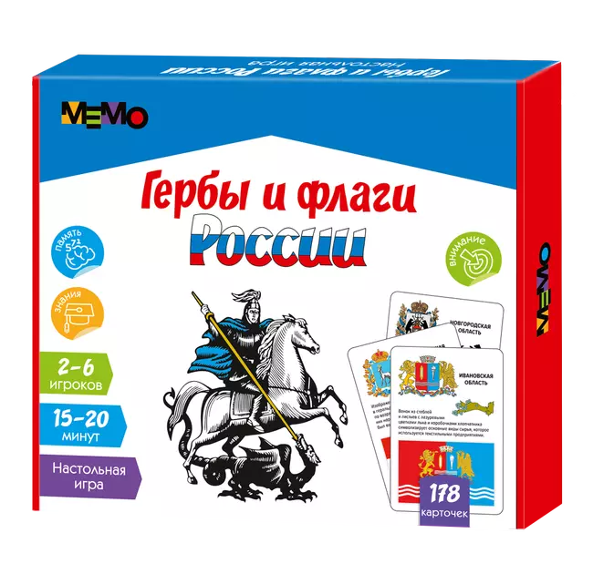 В комплекте 178 карточек с изображениями гербов и флагов, а также краткой информацией о всех регионах, входящих в состав Российской Федерации. В игру можно играть, используя весь комплект или лишь часть карточек. На каждой карточке отдельно вынесен один геральдический элемент и дана его краткая характеристика. Но каждый символ в гербе не может существовать отдельно друг от друга. Лишь совокупность всех символов, а также значение цветовой гаммы может дать полное представление о том или ином регионе. Также важно знать историю и географические особенности земель, чтобы у вас сложилось полное и правильное понимание герба. Участвовать в игре могут от 2 до 6 человек. Игра длится 15-20 минут и помогает развить эрудицию, внимание, логику и память.