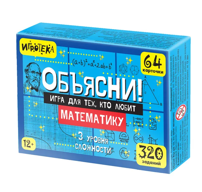 Увлекательная игра «Объясни! Игра для тех, кто любит математику» создана победителем конкурса «Учитель года России – 2018» Алиханом Динаевым. На 64 игровых карточках написаны задания по математике трёх уровней сложности. Участники игры объясняют друг другу слова, среди которых имена великих учёных, математические формулы и понятия, геометрические фигуры. Отгадывая их, они набирают очки, соревнуясь...