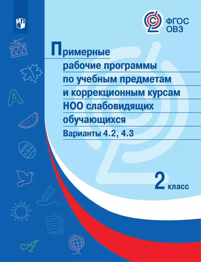Примерные рабочие программы по учебным предметам и коррекционным курсам НОО слабовидящих обучающихся разработаны в соответствии с требованиями ФГОС НОО обучающихся с ОВЗ для 2 класса по вариантам обучения 4.2 и 4.3. Каждая примерная рабочая программа содержит пояснительную записку, основное содержание учебного предмета, коррекционного курса, календарно-тематическое планирование, рекомендации по учебно-методическому и материально-техническому обеспечению образовательной деятельности и планируемые результаты изучения учебного предмета, курса. Программы одобрены решением федерального учебно-методического объединения по общему образованию (протокол №3/20 от 17.09.2020).