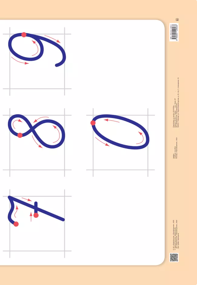 На демонстрационной таблице представлены печатные и рукописные цифры от 0 до 9, а также правильный порядок при их написании. Пособие универсально и может быть использовано как необходимое дополнение ко всем существующим сегодня курсам математики в начальной школе.