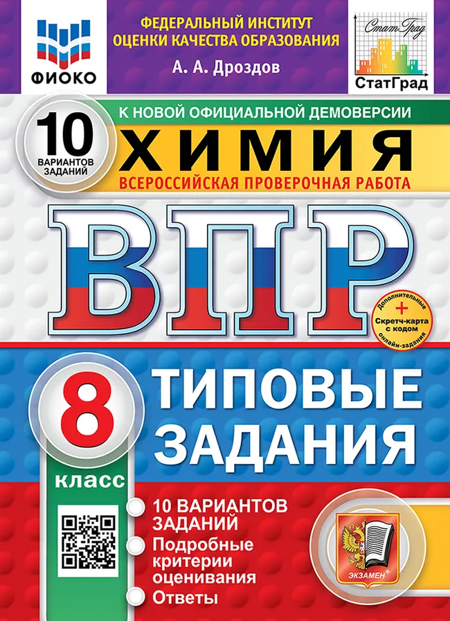 Перейти к описанию и характеристикамВПР. ФИОКО. СТАТГРАД. Химия. 8 класс. 10 вариантов. Типовые задания. ФГОС новый + Sc.