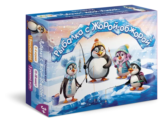 Это пингвинчик Жора-обжора, любимец всех обитателей Антарктиды. Его имя говорит само за себя: он большой любитель вкусно поесть. Жора очень хочет разнообразить свой рацион, поэтому он приглашает вас отправиться с ним в путешествие по ледяным просторам Арктики и Антарктики — на рыбалку.